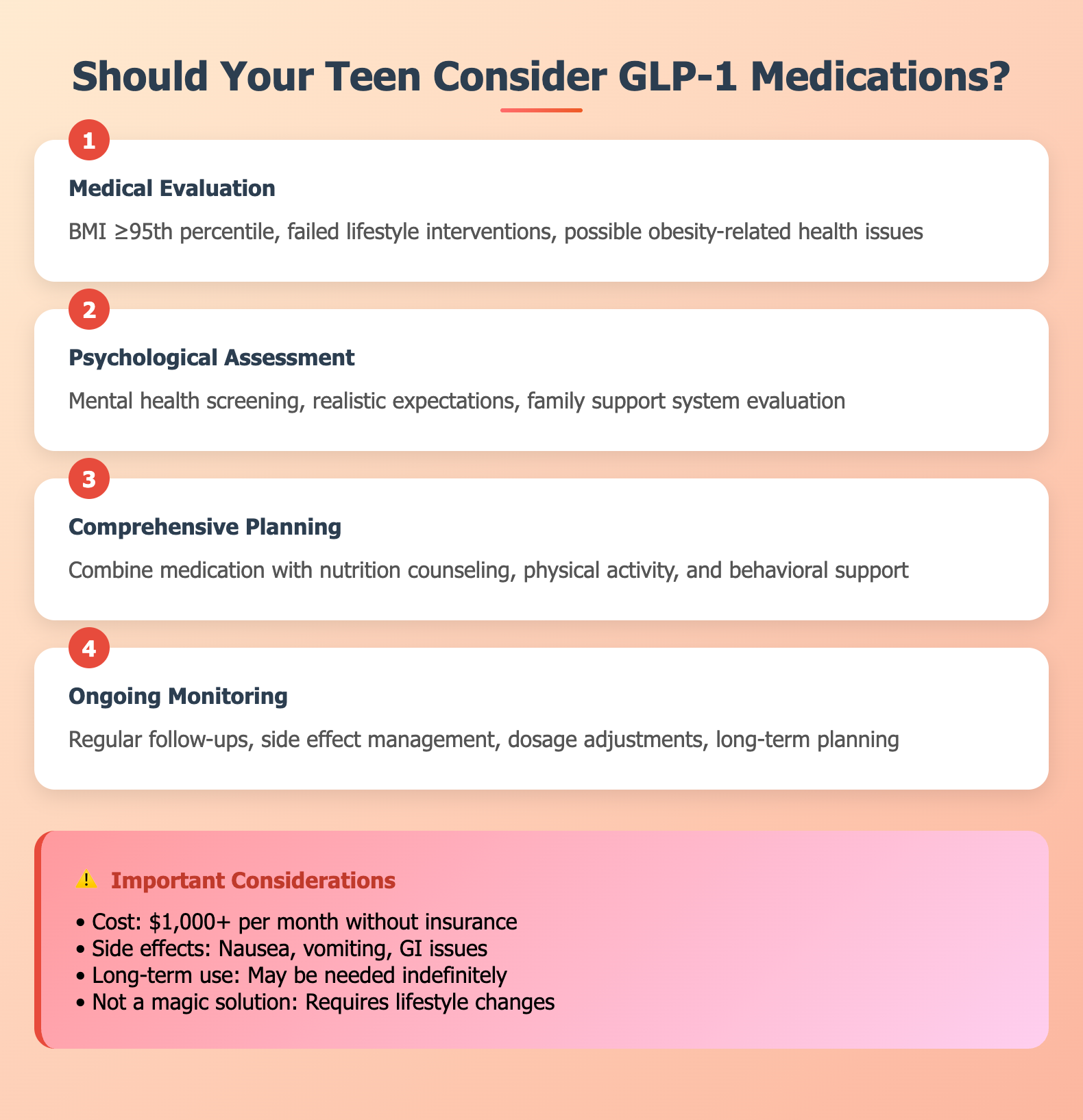 The decision about whether a teenager should use GLP-1 medications requires careful consideration of the individual adolescent's medical, psychological, and social circumstances. This decision-making process should involve the teenager, their parents or guardians, and qualified healthcare providers.