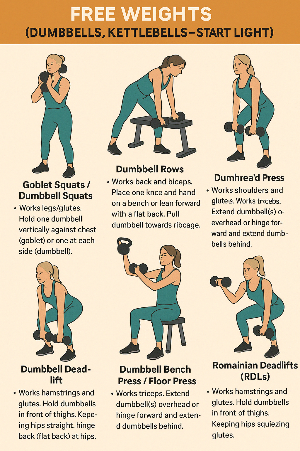 - Goblet Squats / Dumbbell Squats: Works legs/glutes. Hold one dumbbell vertically against chest (goblet) or one dumbbell in each hand at sides.42